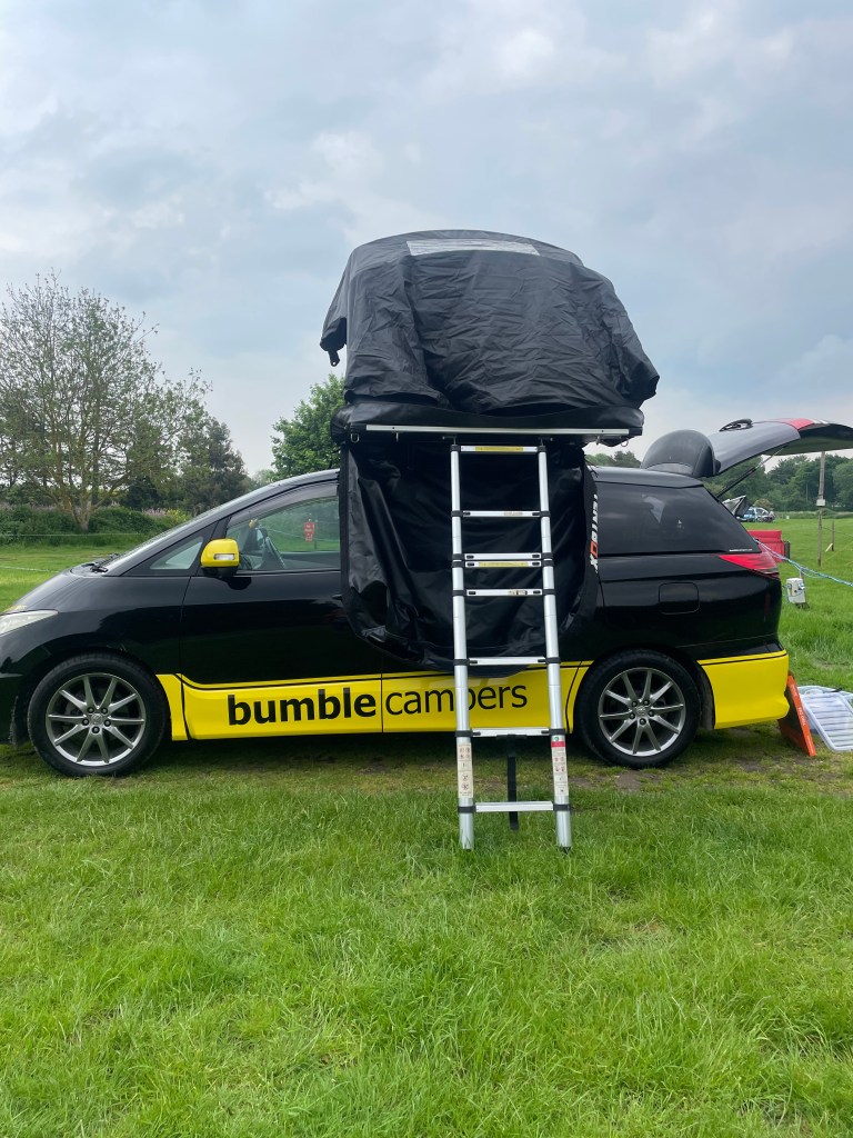 Getting set up at the camp site in Spilsby. J found the roof tent easy to unfold and comfy to sleep in.