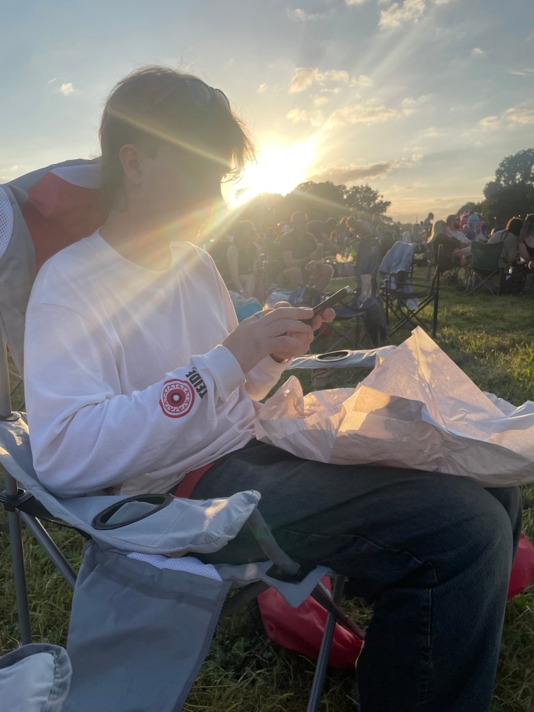 Hopping back into Honey, we stopped in the next village to buy fish and chips which we stuffed into J’s rucksack to eat when we arrived. Parking was easy but it was a bit of a trek from the car park to the concert. We took our camping chairs with us. You should have seen the security lady’s face when she went to check J’s bag and felt a soft warm package of fish and chips.